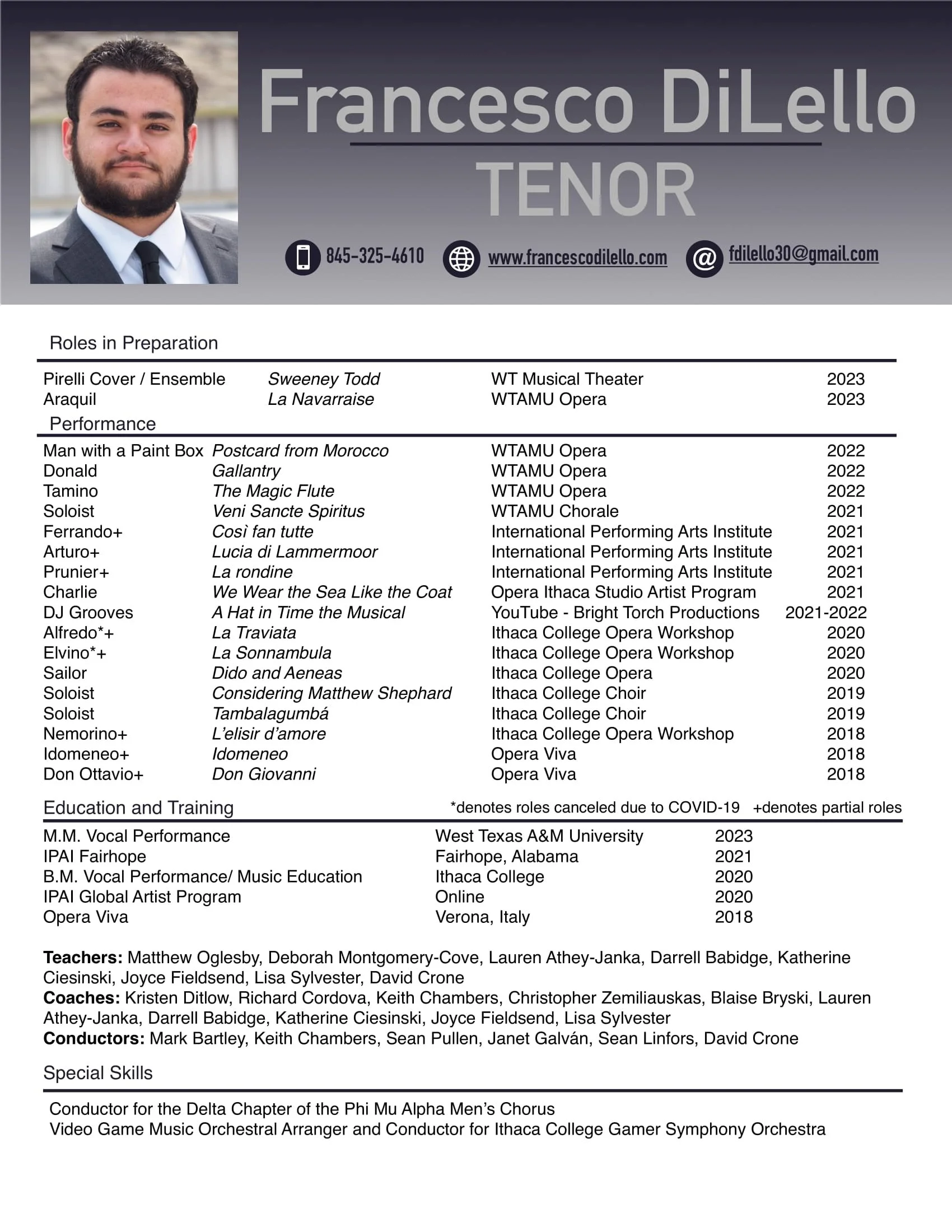 Francesco DiLello graduated from Ithaca College in December 2020 with a B.M. in Vocal Performance and Music Education and is currently working on his Masters Degree in Voice Performance at West Texas A&M University.
